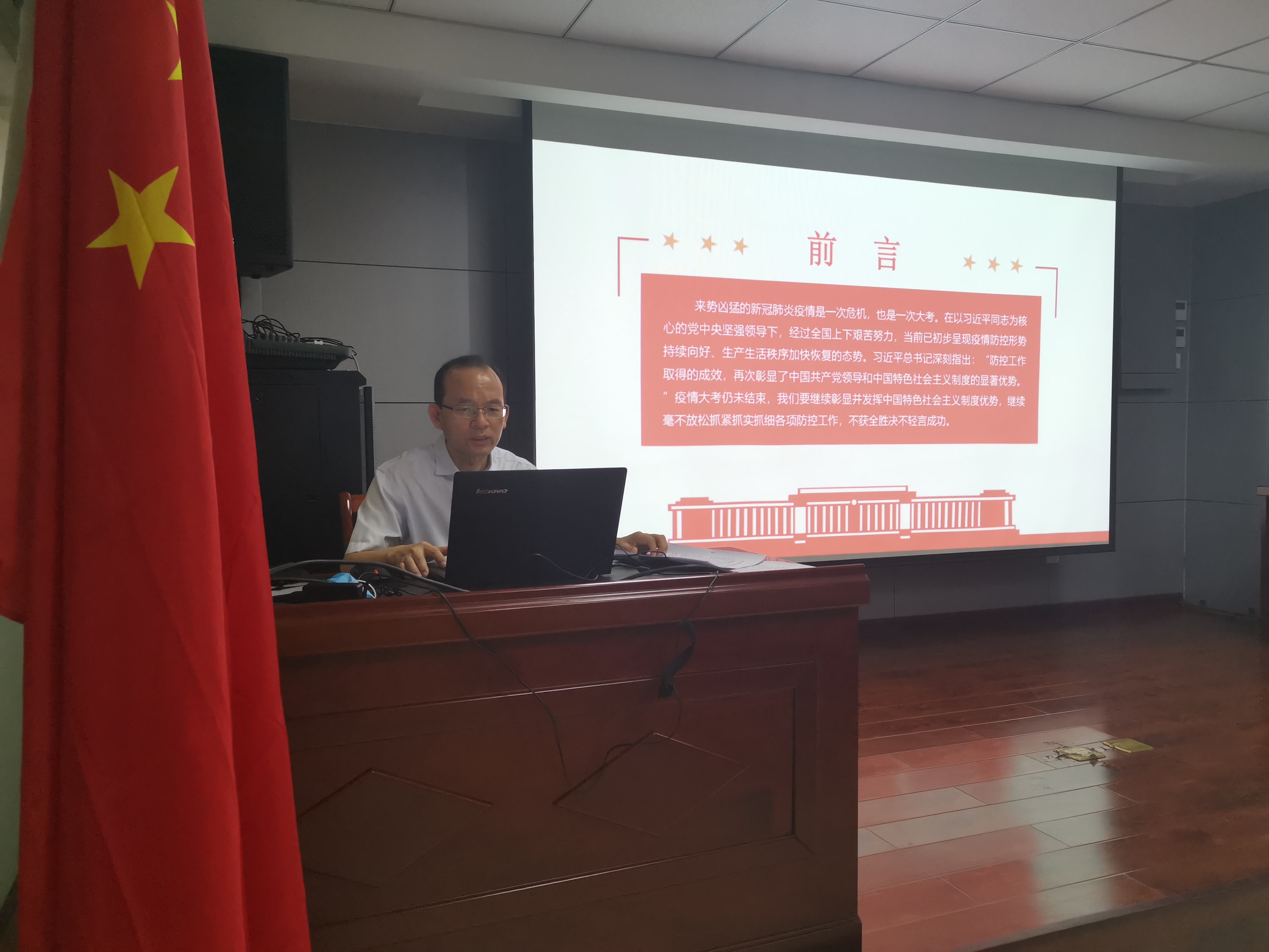 2020年7月2日上午,中共乐鱼手机网页版登录入口第二支部委员会支部书记焦俊良同志以“在大考中彰显中国特色社会主义制度优势”为题,为全体支部党员和入党积极分子上了一堂别开生面的党课。